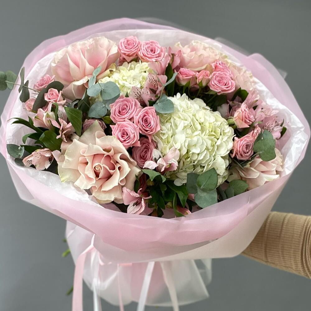 Букет "ПЛОМБИР" из альстромерии, гортензии, эвкалипта, кустовой и французской розы Этот свежий и воздушный букет воплощает радость и легкость летнего вдохновения. В его составе гармонично сочета...