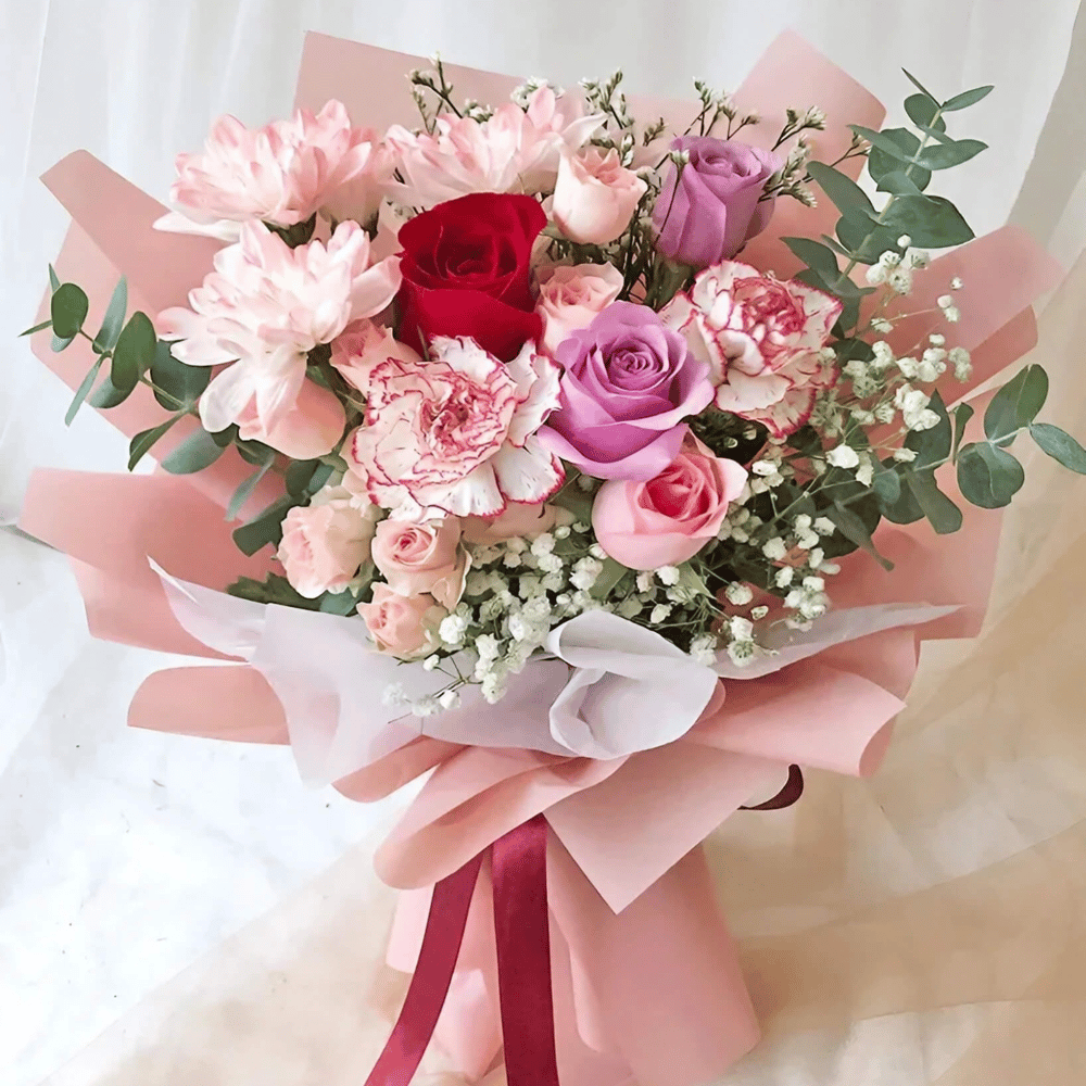 Букет с составом из роз, роз кустовых, гвоздик, гипсофилы, хризантем кустовых и пистации, представлен в элегантной упаковке. Он воплощает нежность и изысканность, создавая атмосферу романтики и красо…
