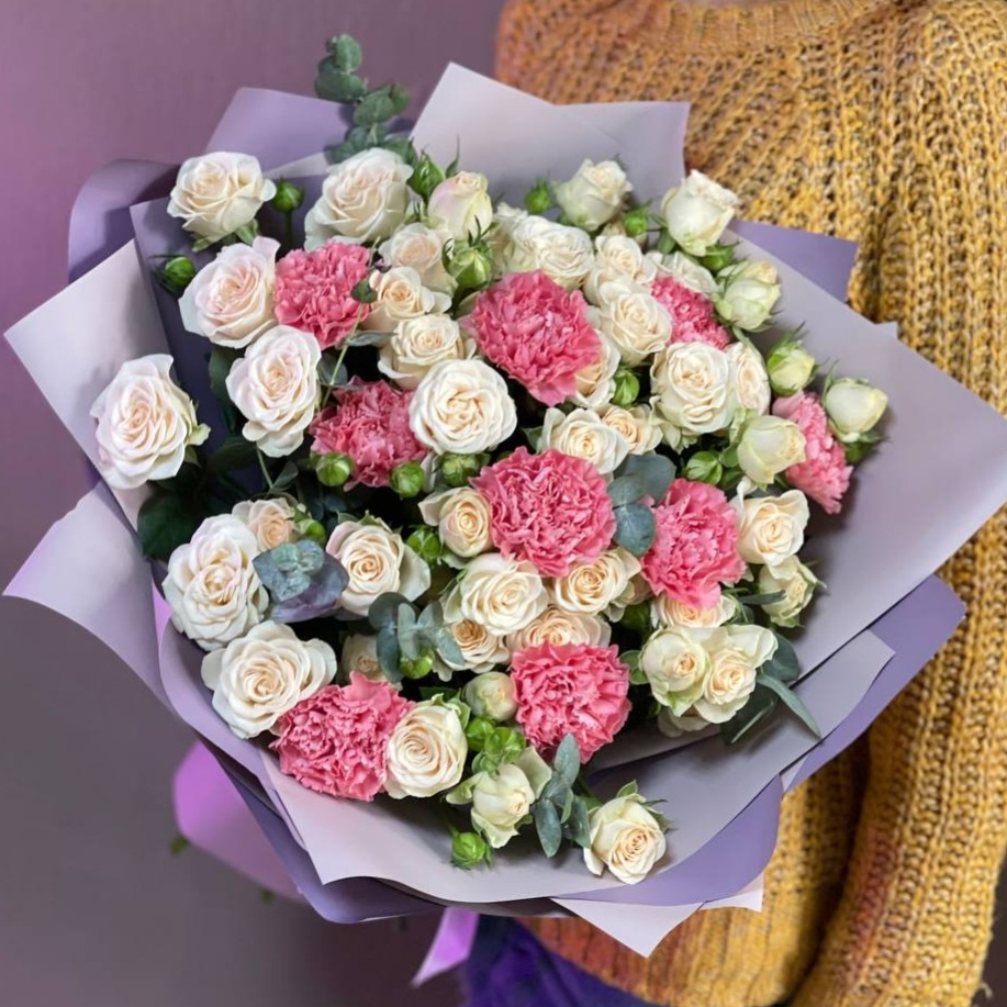 Сборный букет с нежнейшей кустовой розой, стойким диантусом и ароматным эвкалиптом