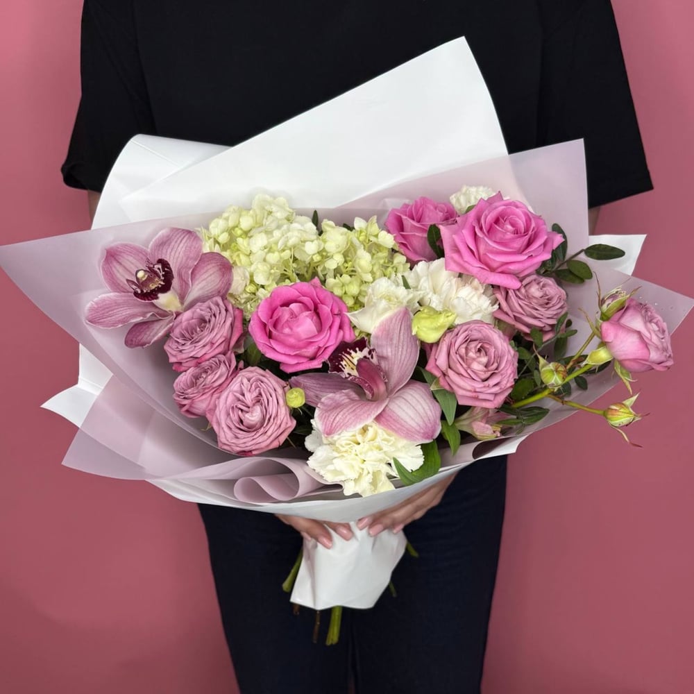 Букет с гортензией,кустовыми розами и орхидеей цимбидиум