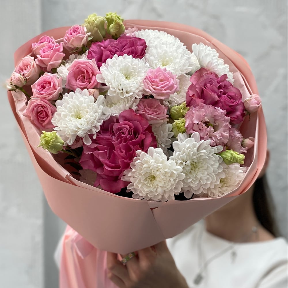 Сборный букет с пионовидными розами,эустомой и хризантемой В подарок к букету : -открытка с вашими пожеланиями -инструкция по уходу за букетом -средство для продления стойкости цветов