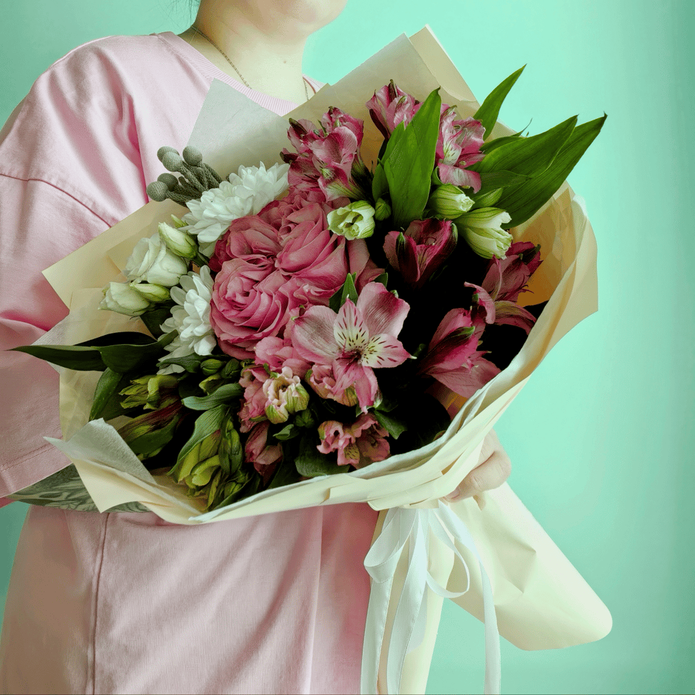 Лето в полном расцвете — в этом чудесном букете! Сочные оттенки, нежная палитра и живая энергия природы: благородные розы, пёстрые альстромерии и воздушные хризантемы сплетены в единую композицию, ко…