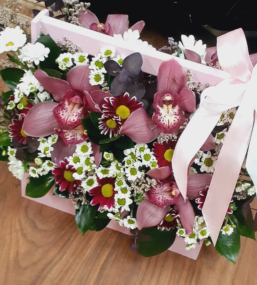 Коробка с цветами «Счастливый миг» из хризантем и орхидей