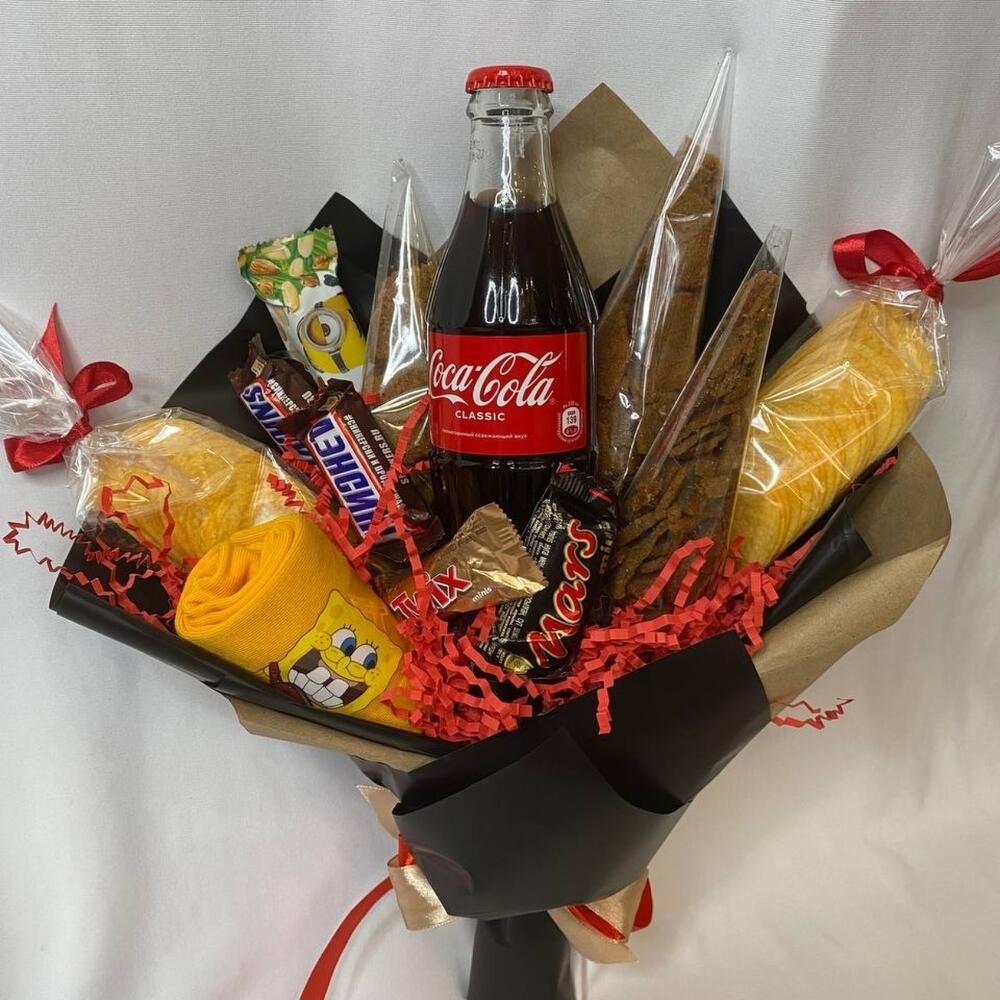 Состав: кока колла - 1 шт. сухарики в кулечке - 3 шт. Носки мужские - 1 шт. Чипсы pringles - 2 шт. Сникерс мини - 2 шт. Марс мини - 1 шт. Твикс мини - 1 шт. батончик гадкий я - 1 шт. Дизайнерская упаковка - 1 шт.