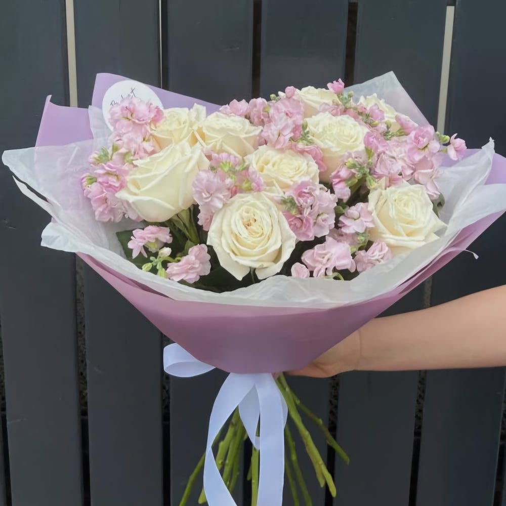 Нежный букет с кустовой маттиолой и белыми розами, оттенок маттиолы может быть более сиреневым или белым по желанию заказчика