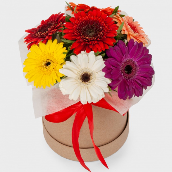 Яркий и запоминающийся презент - букет в шляпной коробке, составленный из семи крупных гербер разных цветов. Такой букет сможет поднять настроение своим видом и станет прекрасным пожеланием счастья, яркости жизни и удачи во всем!