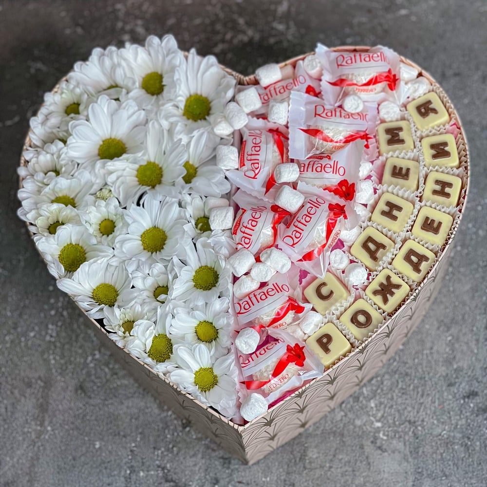 Состав: -шоколадные буквы «с днем рождения» (можно поменять); -кустовые хризантемы; -маршмеллоу белые; - конфеты raffaello 9шт. Дизайн коробки и цвет хризантемы могут отличаться от представленных на фото.