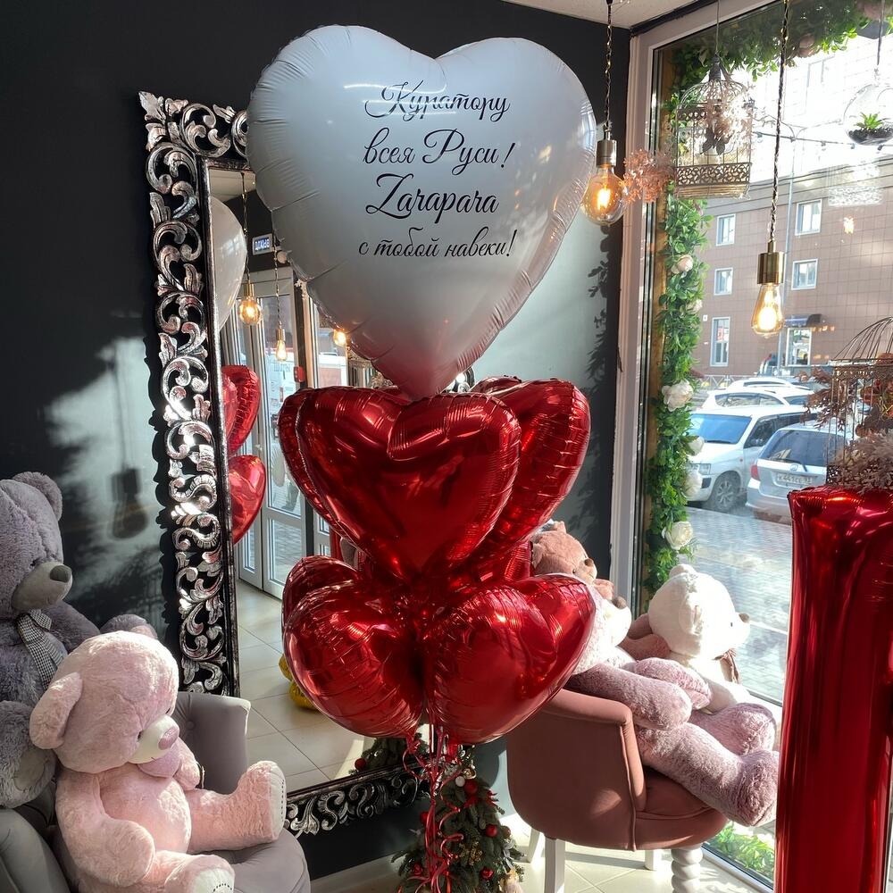 6 красных сердец и 1 белое с любой индивидуальной надписью. Надпись для шара оставьте в комментариях к заказу.
