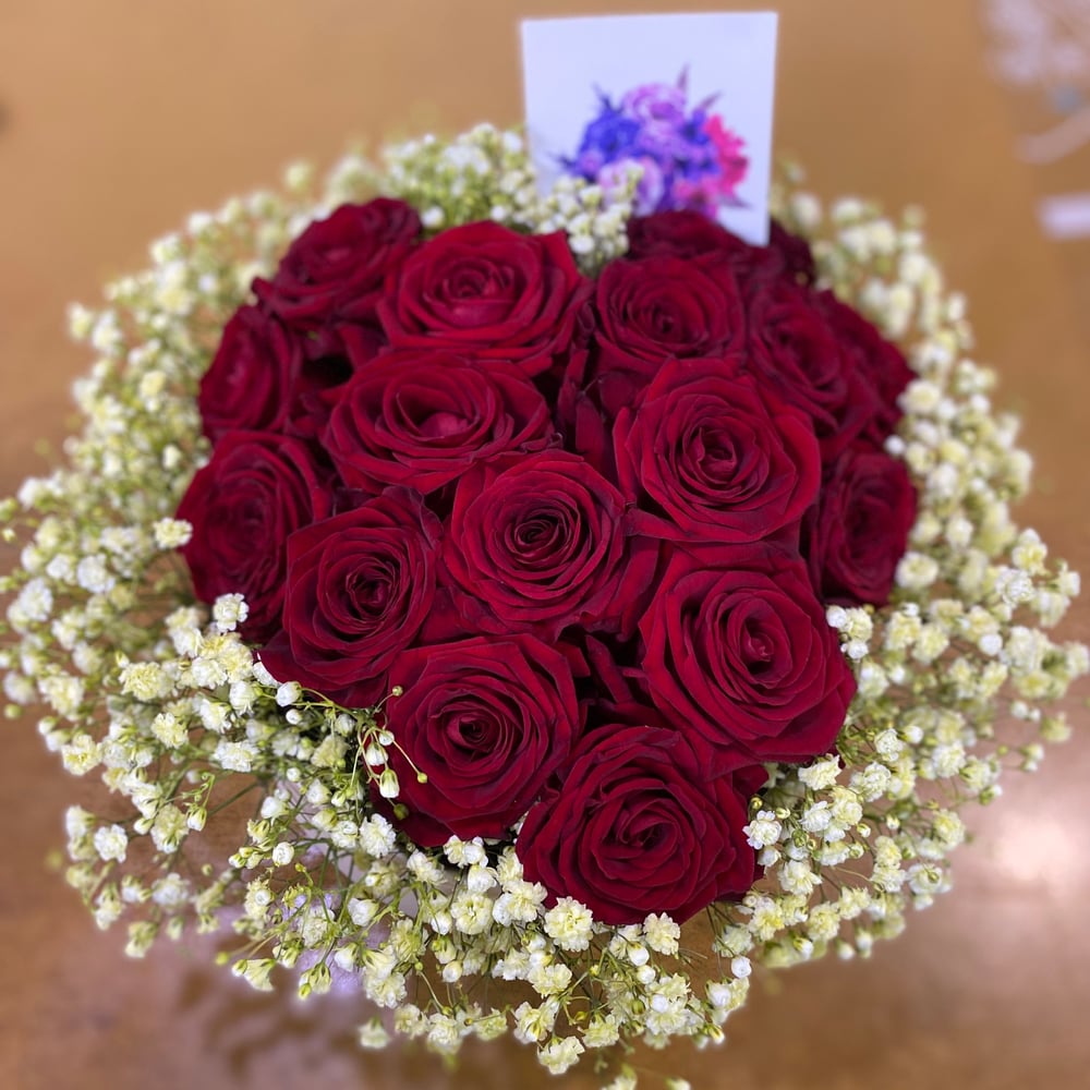 Коробка с красными розами и гипсофилой расскажет вашей второй половинке о ваших чувствах без слов.