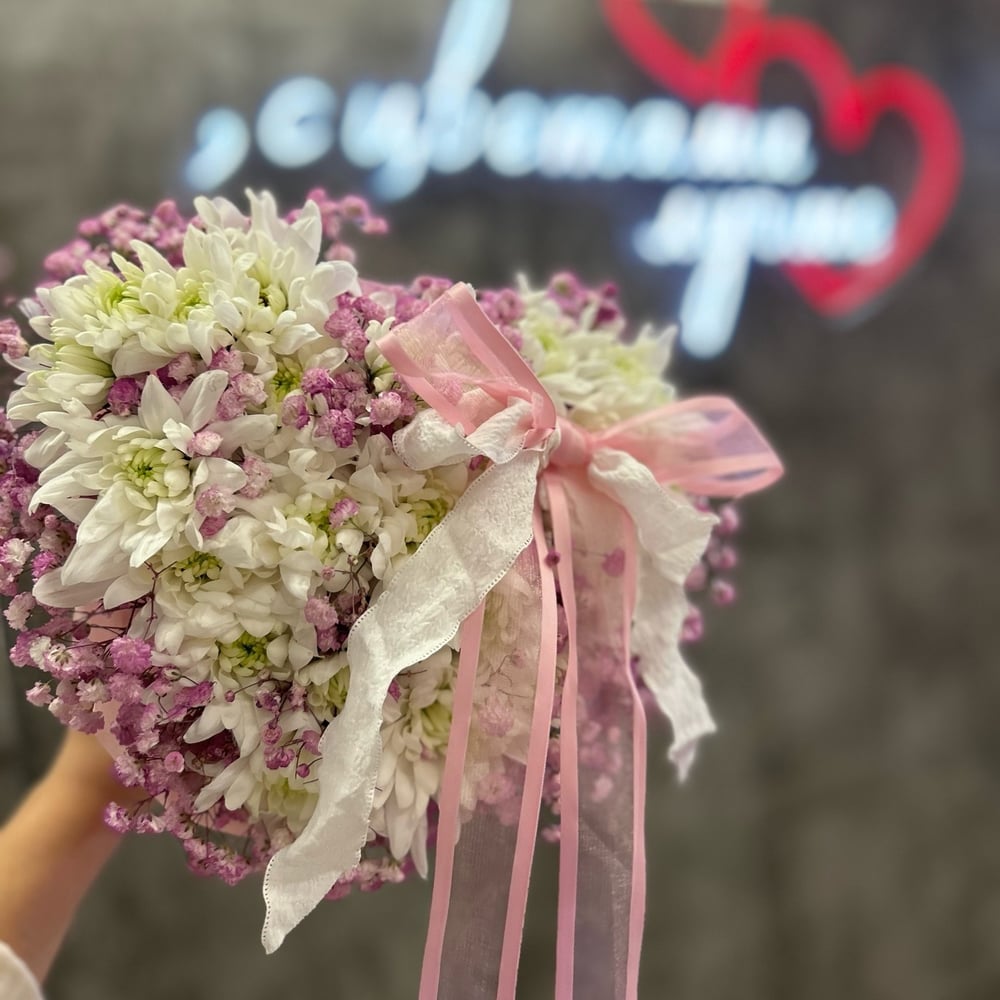 Композиция в форме сердца «Сердце из цветов» из хризантем и гипсофил