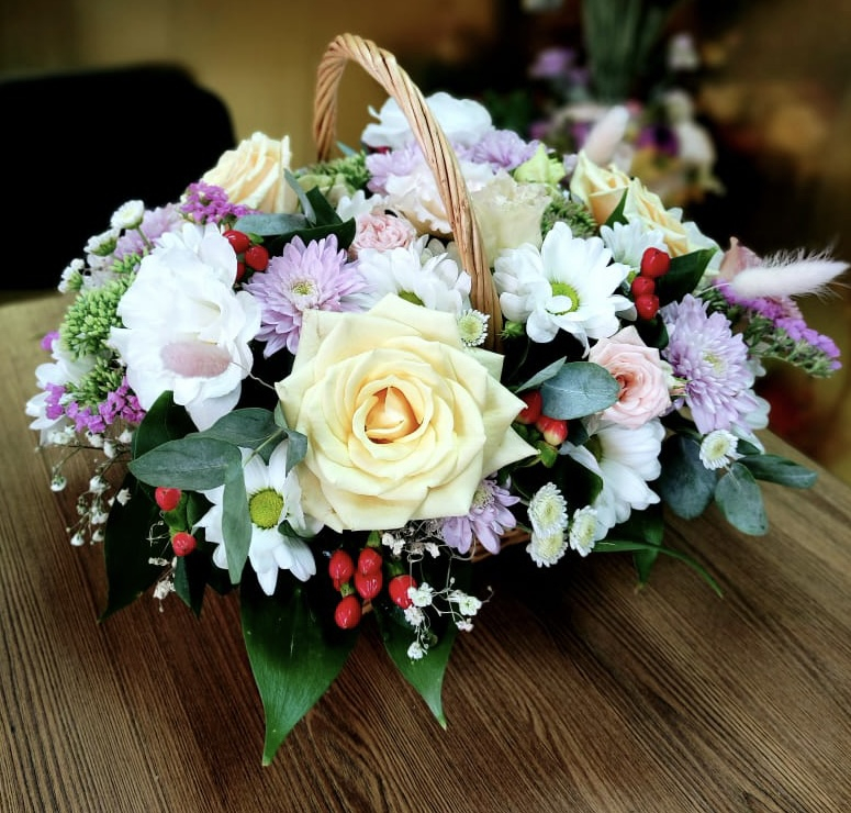 Аппетитная корзинка со свежайшими цветами произведет впечатление на Вашу даму