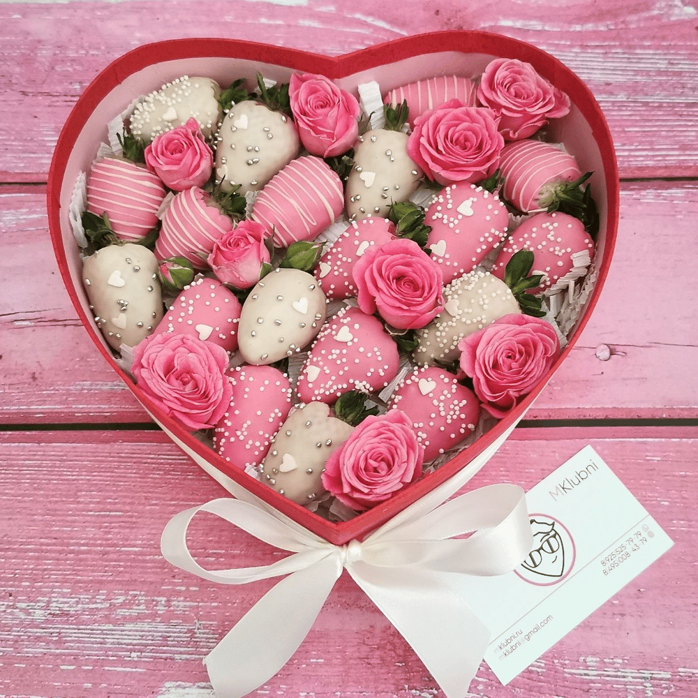 Сочная клубника в бельгийском шоколаде с добавлением кустовых роз в коробочке в форме сердца! Чудесный и милый подарок для близкого человека.