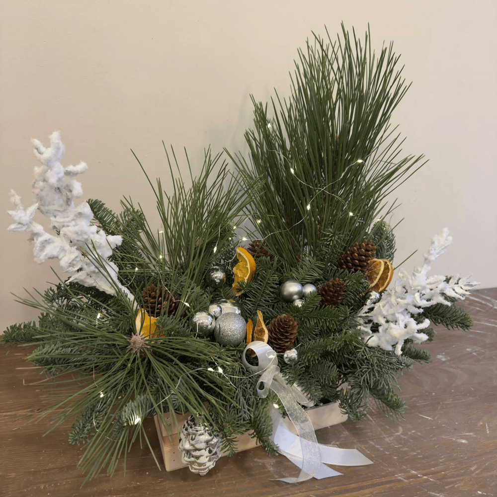 Основу украшения составляют ветви хвойных растений — бархатистая хвоя нобилиса, упругие иголки сосны и изящные веточки кипариса. Они переплетаются, создавая атмосферу морозного леса и наполняя пространство хвойным ароматом. Среди зелени уютно расположились крупные шишки, добавляющие композиции текстурное разнообразие. Веточки рускуса придают ей лёгкость и воздушность, разбавляя плотность хвойных ветвей. Теплоту и уют вносят палочки корицы, аккуратно вплетённые в композицию. Сушёные дольки апельсина вносят яркие акценты тёплого янтарного оттенка. Композицию дополняют ёлочные игрушки — блестящие серебристые шары, которые отражают свет, создавая эффект мерцания и добавляя праздничного блеска. Тонкая гирлянда с маленькими огоньками, искусно вплетённая в ветви, придаёт украшению волшебное сияние, словно оживляя всю композицию. Мерцающий свет гирлянд подчёркивает текстуру хвои и декоративных элементов, создавая уютную и тёплую атмосферу. Эта композиция воплощает атмосферу зимнего волшебства, наполняя пространство теплом, ароматами и предвкушением новогодних чудес. Она идеально подойдёт для украшения праздничного стола или интерьера, создавая настроение уюта и радости.