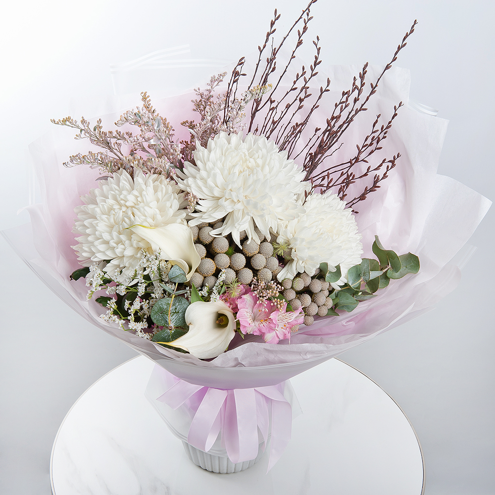 Невероятной красоты серебряные сны в цветах этого прекрасного букета. Серебристые хризантемы, сияющие каллы, яркие альстромерии, загадочный озотамнус и лимониум сливаются в самый прекрасный сон, Бруния и эвкалипт прекрасно дополняют букет и создают изысканную композицию. Современная упаковка и декоративные ветки добавляют букету особый стиль, идеально передавая ваши чувства.