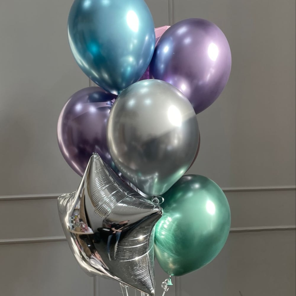 1 фольгированный шар в виде звезды и 6 латексных разноцветных шаров