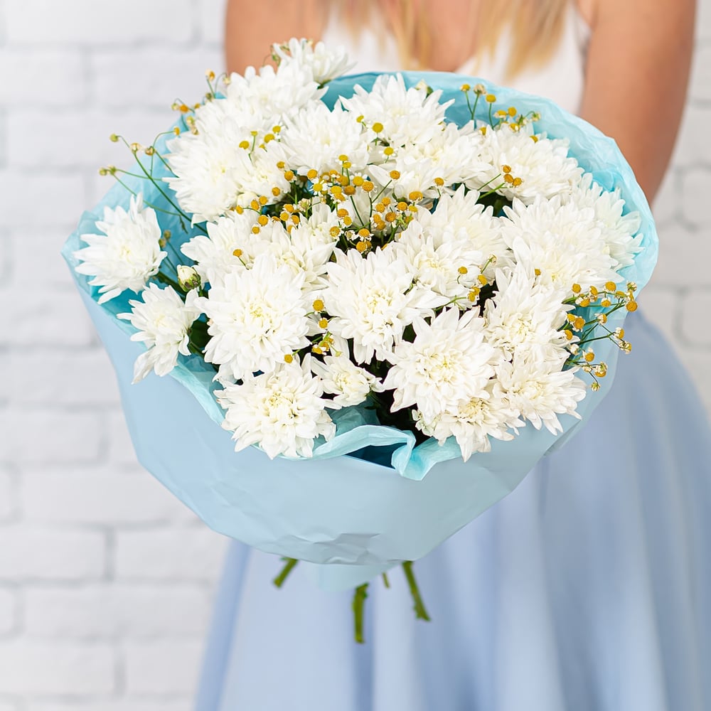 Привлекательный и лаконичный букет из хризантемы.