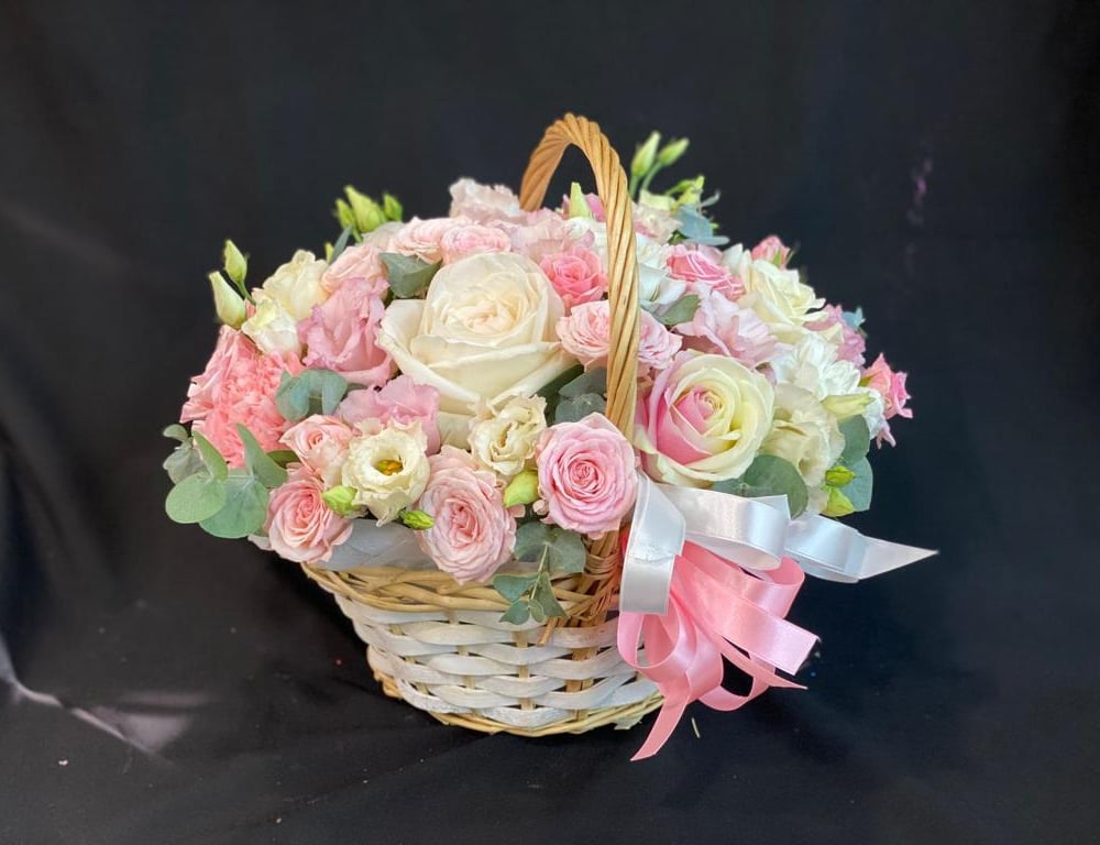 Корзина с цветами «Шарлотта» из роз и эустом