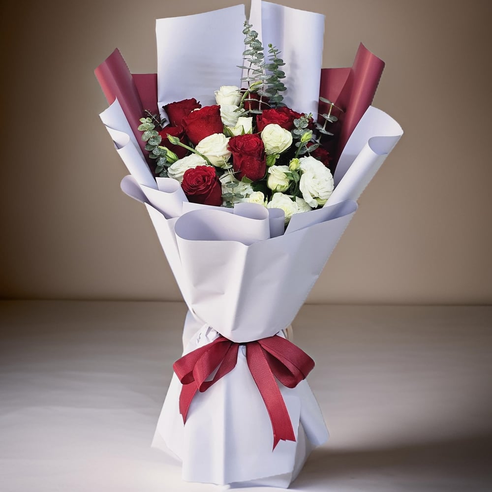 Красные розы и лизиантус, упаковка в едином стиле, доставка в тот же день по Dubai Sharjah & Ajman.