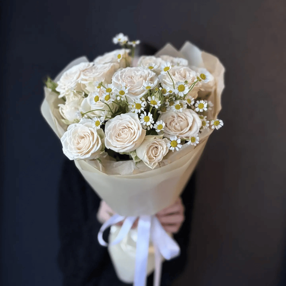 "Шепот утренней росы" – авторский букет, сотканный из нежности кустовых роз и простоты ромашек, словно утренний туман, окутывающий душу теплом и светом. Это не просто цветы, это – послание, полное лю…