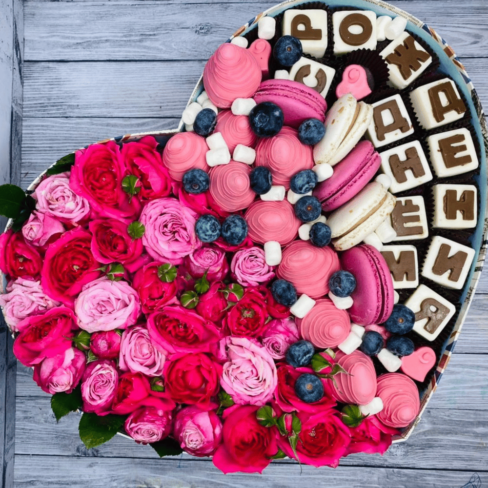 Коробка сердце с живыми цветами , ягодами и сладостями