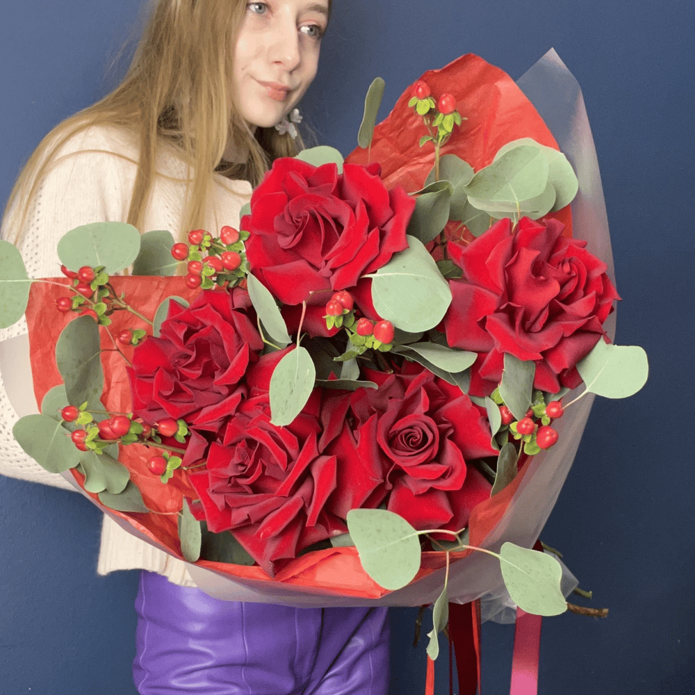 Шикарный букет из красных французких роз и ягодами гиперикума