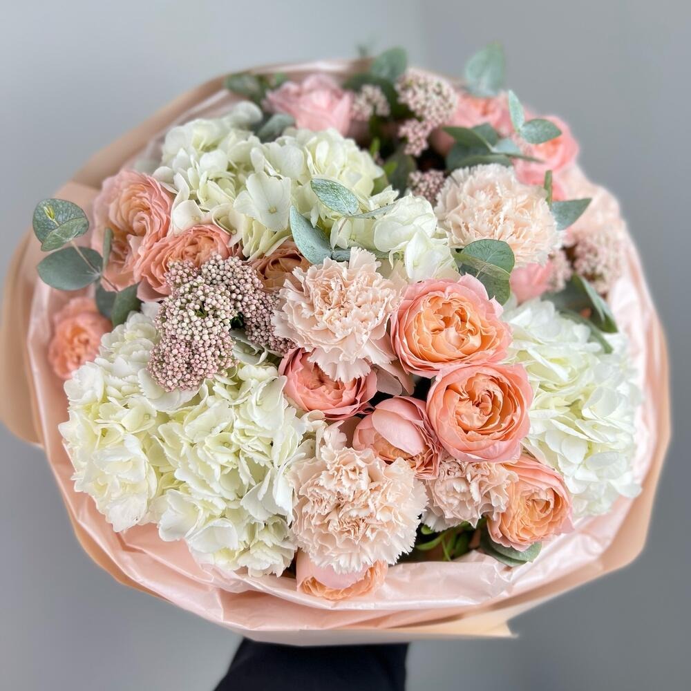 Шикарный букет с белой гортензией из гвоздик и роз