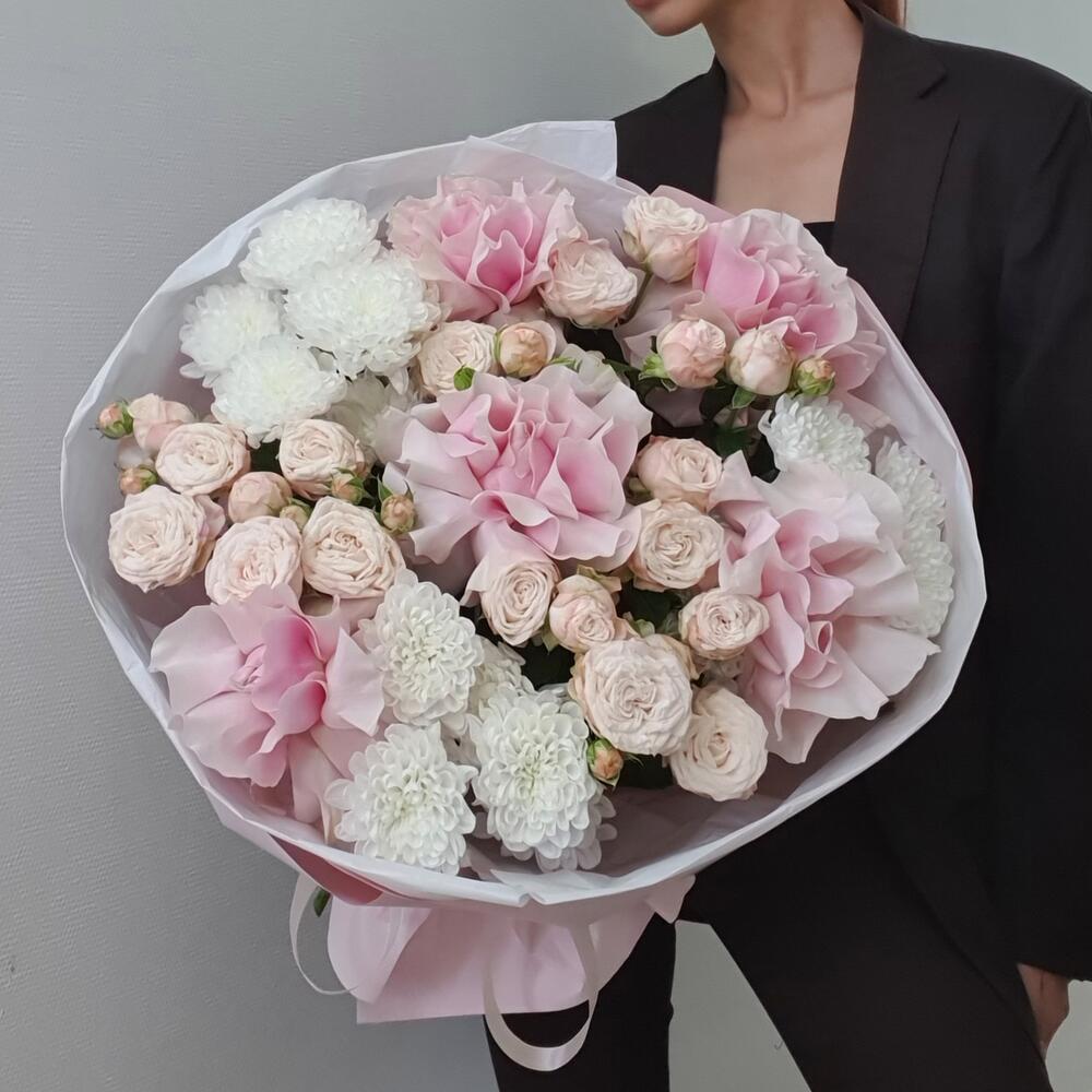 Шикарный круглый букет из роз и хризантем