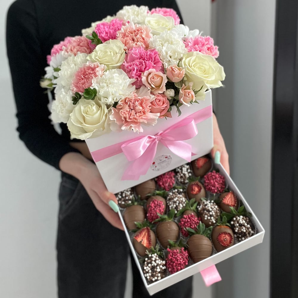 Свежая клубника в молочном бельгийском шоколаде украшена кондитерскими шариками дутый рис, сублимированная малина, слайсами сушеной клубники Диантусы белые, диантусы розовые, белые розы, кустовые розовые розы, зелень размер коробки 20*20*20 см Высота композиции - 30 см Выдвижной ящик со свежей клубникой в бельгийском шоколаде Рекомендуемый срок хранения клубники в шоколаде 24 часа При температуре +2-+8 Открытка с вашим текстом в подарок