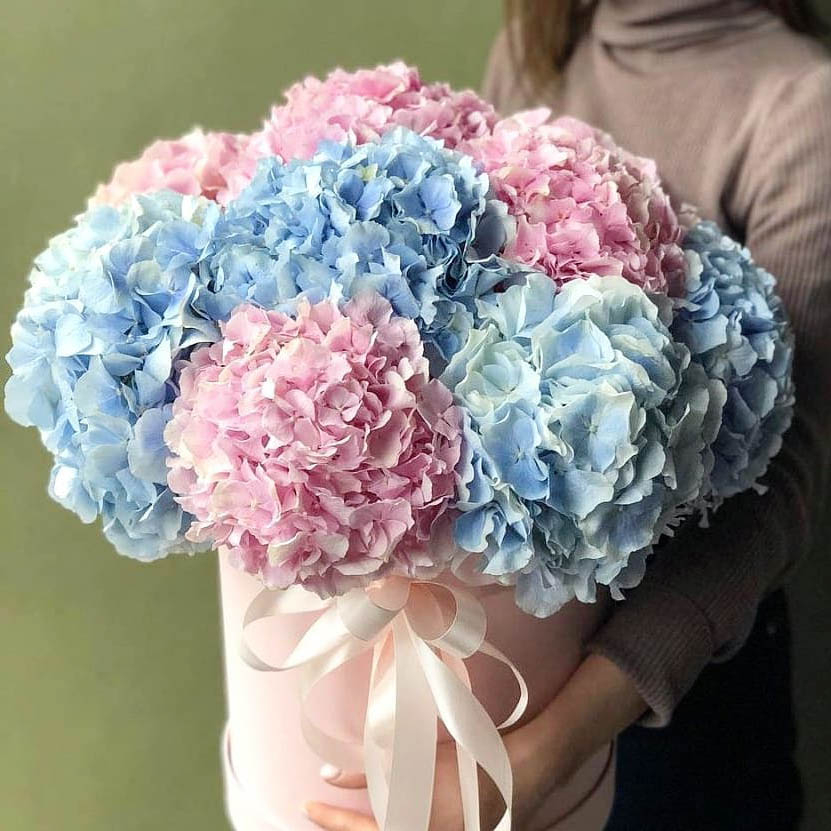 Состав: Шляпная коробка L (Pink) , Гортензия Pink/Blue - 9 шт, Атласная лента Размер: Диаметр: 45 см / Высота: 45 см Пушистые бутоны гортензий как будто специально созданы для самых дорогих – эти цветы хочется дарить мамам, сестрам, бабушкам, любимым❤ Разноцветные гроздья, собранные в одном букете, смотрятся восхитительно. Букет из гортензии - это всегда стильный подарок😍 Гортензия очень любит воду и влажность, поэтому воды должно быть налито вплоть до пышной шапки. Можно прям обрызгивать сами соцветия обильно водой) И тогда она будет радовать вас очень долго!