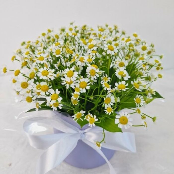 На языке цветов матрикарии считаются символом семьи, любви и верности. Очень воздушная и аккуратная композиция станет украшением в любом доме. Прекрасно подходит в качестве знака внимания и проявления ваших чувств!