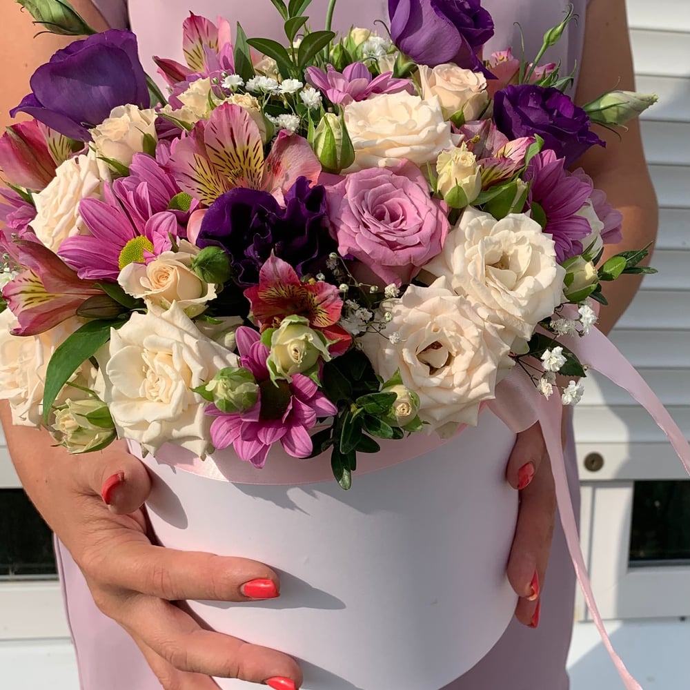 Композиция «Шляпная коробка с цветами» из роз и эустом