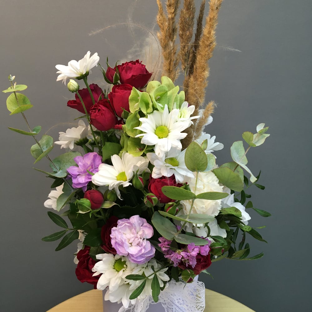 Букет в шляпной коробке сделан с любовью и тщательно собран из разнообразных цветов и зелени. Он включает в себя прекрасные сочетания диантуса, молюцеллы, пионовидных кустовых роз, колосьев, стифы, фисташки, эвкалипта, хризантемы кустовой и астильбы. Диантус, с его яркими лепестками разных оттенков, придает букету яркость и энергию. Молюцелла добавляет воздушности и легкости, а кустовые розы в форме пиона придают ему роскошный и элегантный вид. Колосья, стифа и фисташка добавляют текстуры и интересные детали, создавая уютную и свежую атмосферу. Эвкалипт и хризантема кустовая дополняют букет своими ароматами и придают ему дополнительную глубину. Астильба, с ее изящными соцветиями, придает букету романтичность и нежность. Упаковка букета включает в себя шляпную коробку, которая придает ему особую элегантность и шарм. Оазис, использованный для крепления цветов, обеспечивает их свежесть и долговечность. Лента кружевная завершает композицию, придавая ей финальное штрихи и приятное дополнение к изысканному образу букета. Этот букет станет великолепным подарком на любой праздник или особый случай.