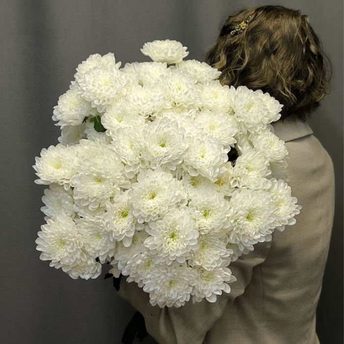 Монобукет из 11 махровых белых кустовых хризантем - SHOUPETTE Белые хризантемы в букете являются символом чистоты и невинности. Они ассоциируются с нежностью и гармонией, приносят свежесть и спо...