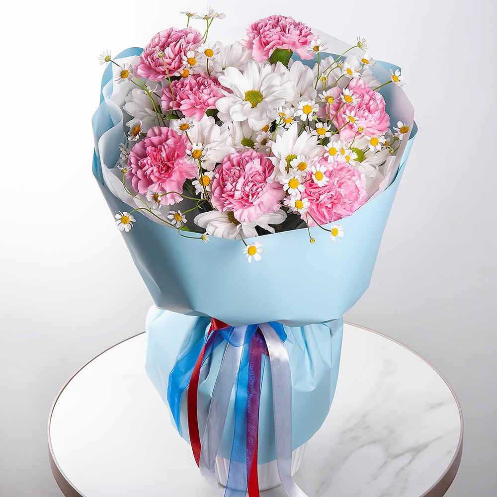 «Симфония Цвета» — букет, который играет оттенками и фактурами, как музыка. Гвоздики, кустовые хризантемы и танацетум создают динамичную, живую композицию, которая смотрится ярко и при этом нежно. Современная упаковка завершает образ и делает букет особенно эффектным.