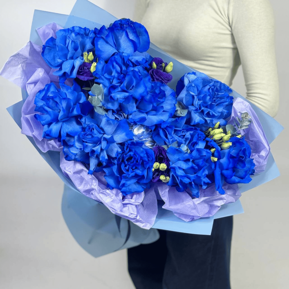 Этот роскошный букет — воплощение элегантности и загадочности. Основу композиции составляют насыщенные синие розы, создающие эффект глубины и благородства. Их королевский оттенок дополнен изысканными…