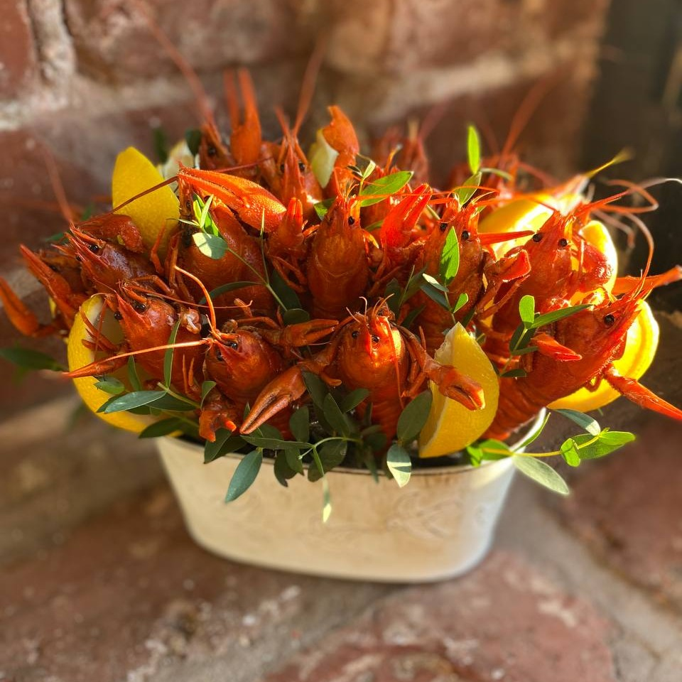 Букет из раков и лимона в металлическом кашпо
