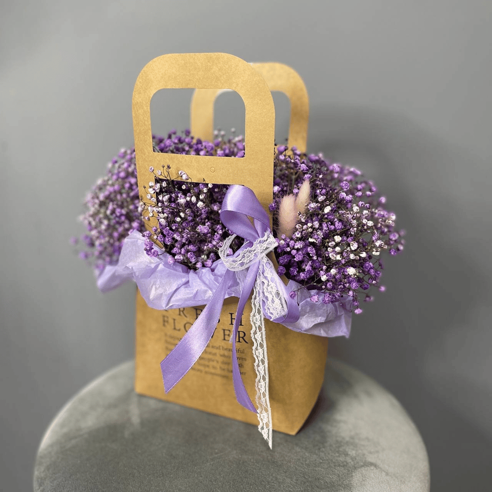 Очаровательная композиция из сиреневой гипсофилы в сумочке - прекрасный весенний подарок для Ваших милых девушек
