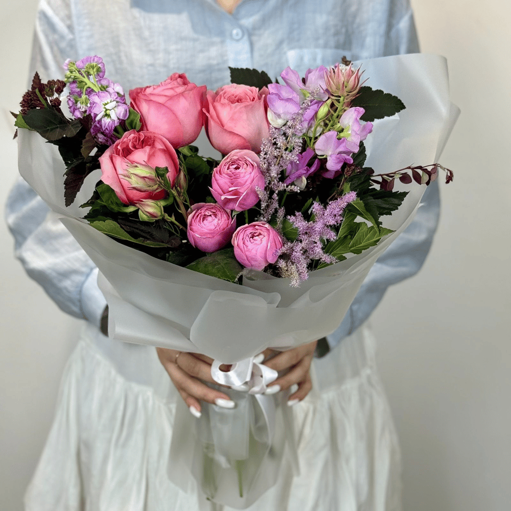 Букет из пионовидной розы, кустовой розы, матиолы и зелени