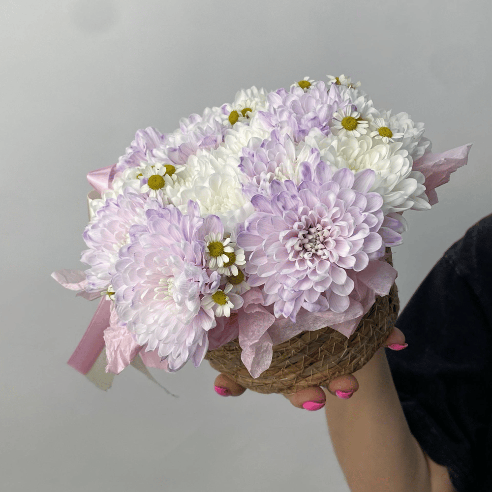 Корзина с цветами «Сиреневая радость» из хризантем