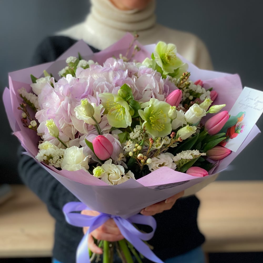 Весенний букет с гортензией и тюльпанами