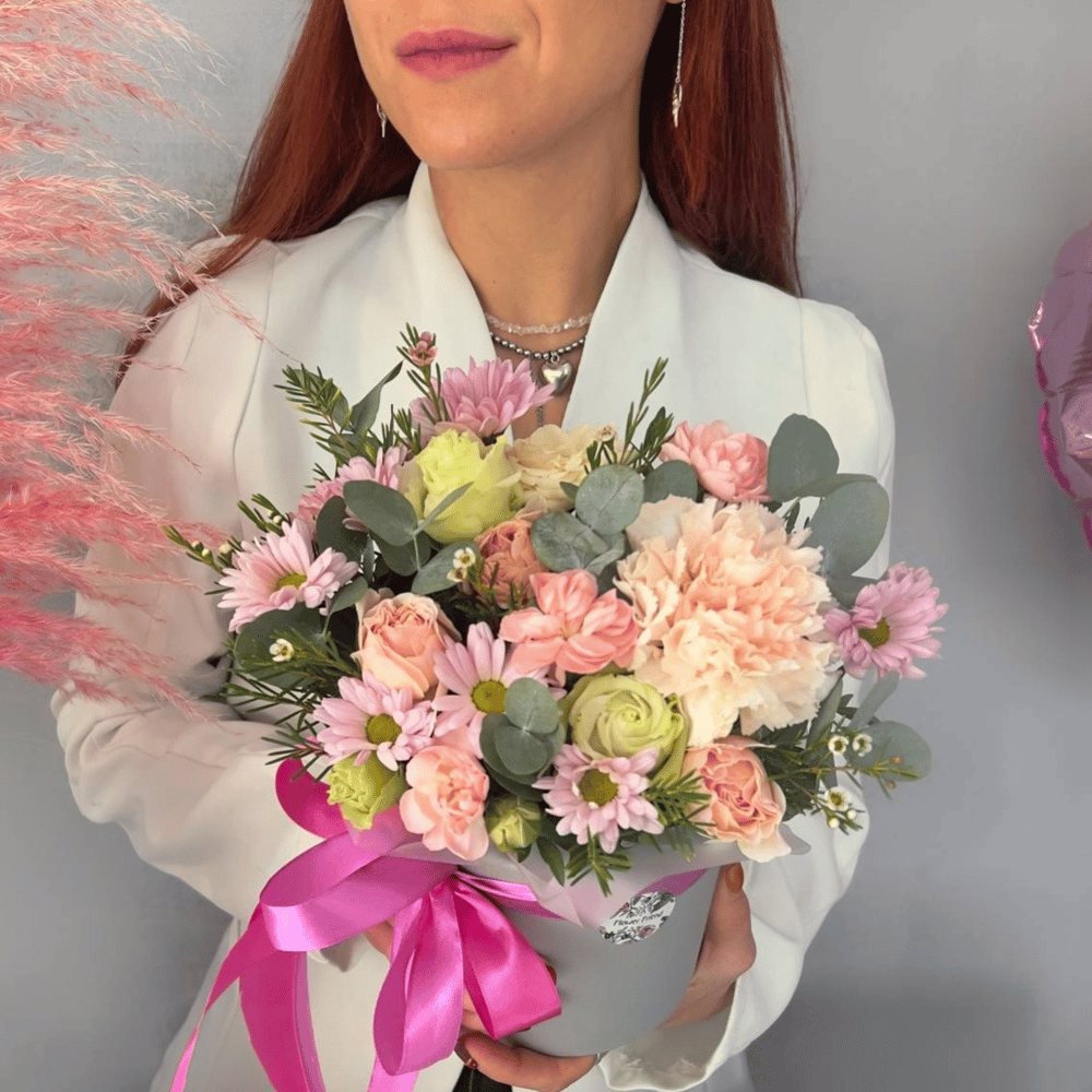 Шляпная коробка с цветами «Сиреневые чувства» из гвоздик и роз