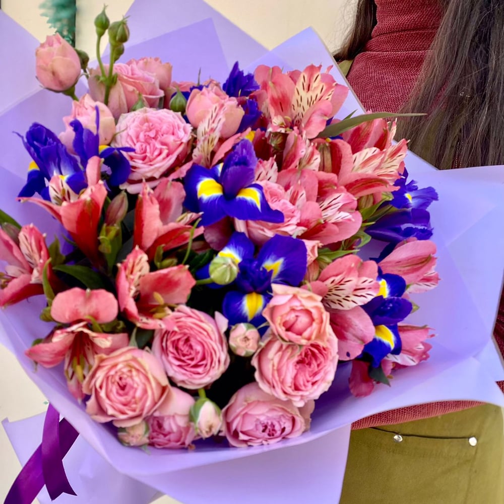 Букет «Сиреневый туман» из ирисов и альстромерий