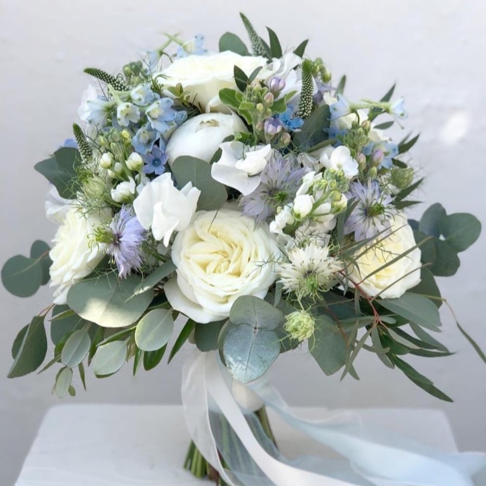 Букет невесты круглой асимметричной формы в белом цвете с вставками флористической зелени — один из самых трендовых букетов сезона. А яркие бутоны вероники и оксипеталума создают интересный цветовой…