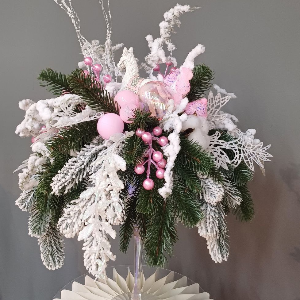 Новогодняя композиция в стеклянном бокале из искусственных веток ели – это изысканное и нежное украшение с акцентом на утончённые детали. Ветви ели насыщенного зелёного цвета создают классическую основу, их пушистая текстура гармонично сочетается с прозрачностью бокала, добавляя композиции лёгкости и глубины. Розовые новогодние игрушки, выполненные в мягких пастельных оттенках, придают декору романтичный и современный вид. Игрушки могут быть матовыми, глянцевыми или украшенными блёстками, что создаёт интересную игру света. Центральным элементом композиции является миниатюрная бело-розовая лошадка — символ детства, радости и волшебства. Её изящные детали добавляют композиции сказочный акцент, делая её идеальной для создания уютной праздничной атмосферы. Бокал подчёркивает изысканность и компактность композиции, превращая её в стильный акцент на столе, подоконнике или каминной полке.