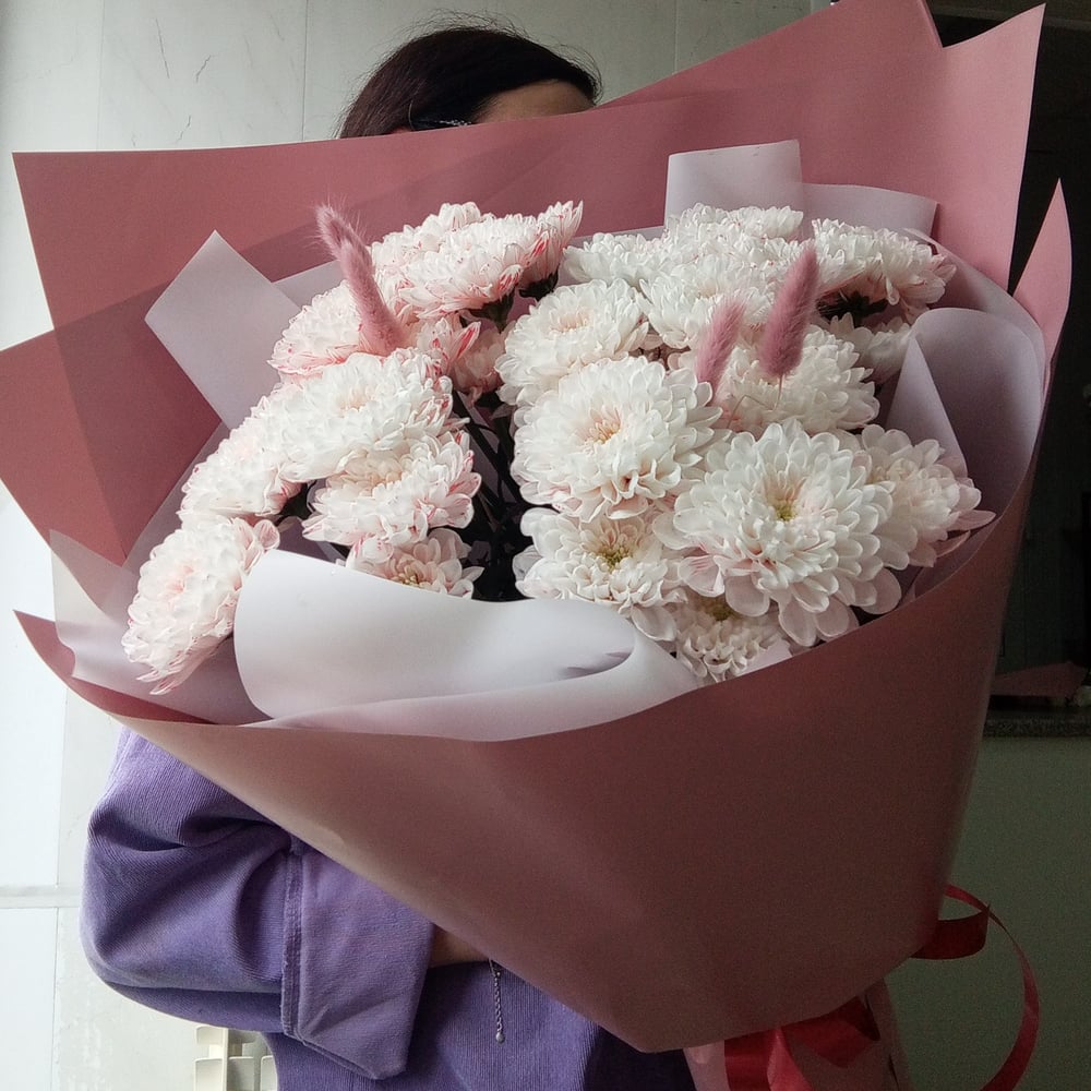 Монобукет из хризантемы собранный по спирали в стильной упаковке