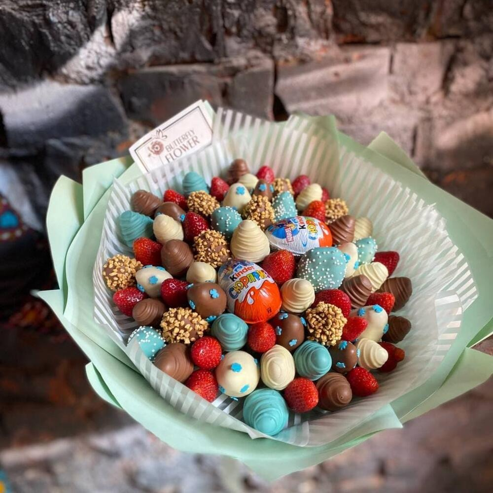 Букет из клубники, киндер-сюрпризов и клубники в шоколаде