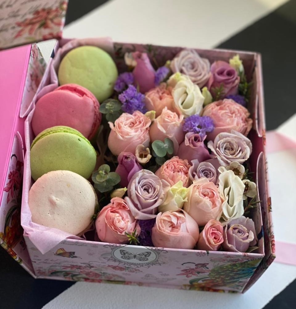 Подарочный набор «Сладкая коробка с макарунс» из роз