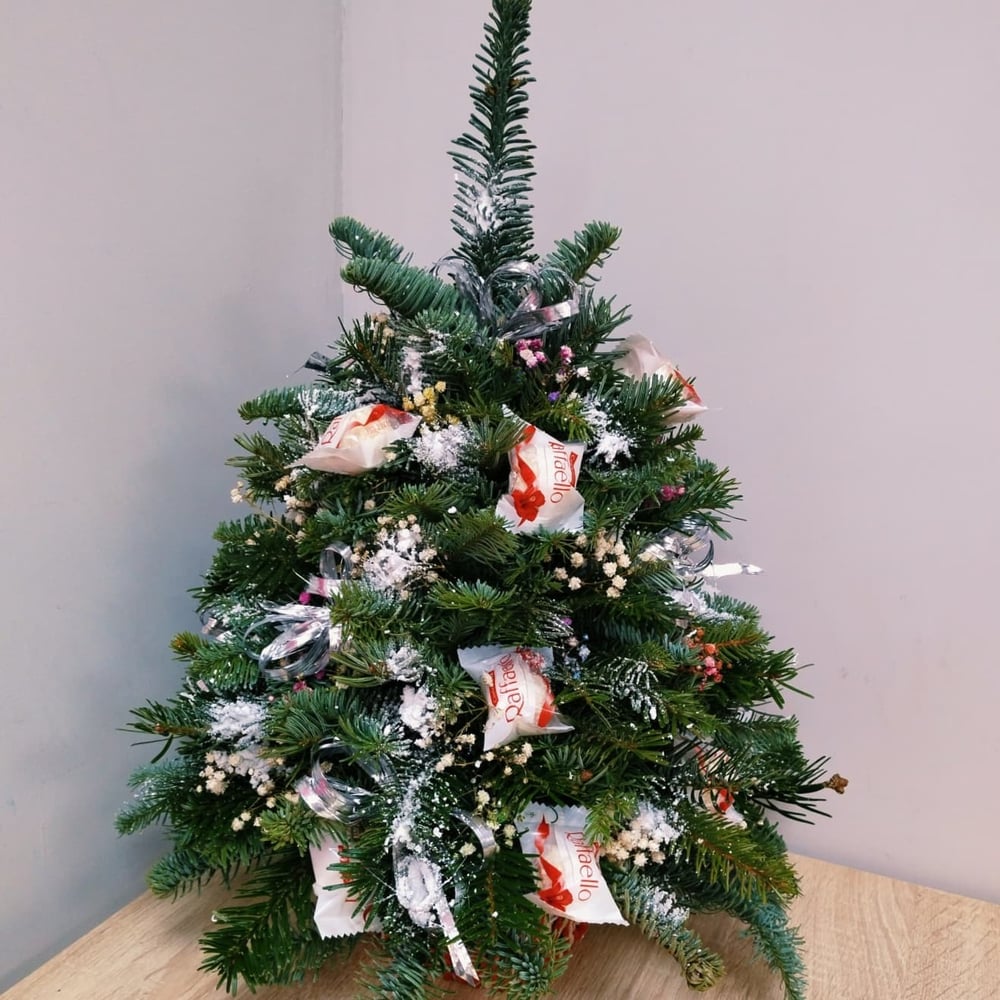 Очаровательная ёлочка будет прекрасным украшением для любого стола. Перед доставкой елочка упаковывается в пленку с лентой для безопасной и красивой доставки