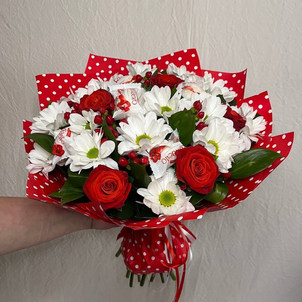 Яркий авторский букет из розы, хризантемы и гиперикума, c конфетами Raffaello. По одной из легенд, Петро Ферреро, который основал итальянскую компанию "Ferrero", производящую вкусные конфеты по...