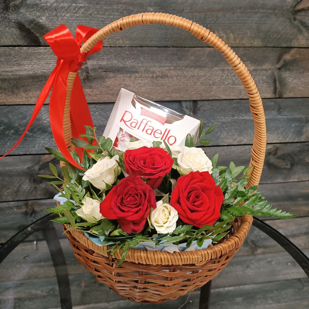 Милая корзиночка с розами и коробочкой конфет Рафаэлло.